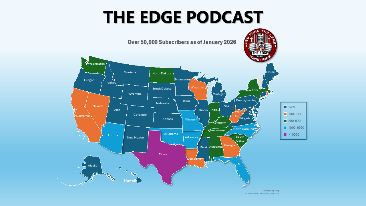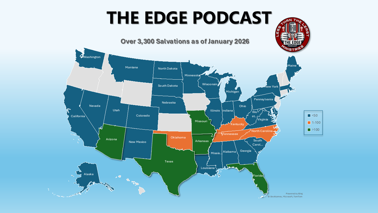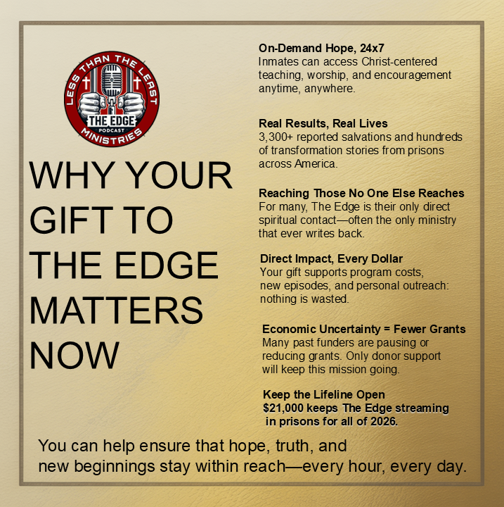 Every week, lives are changed because The Edge Podcast reaches deep into places most people never see—prisons, jails, and cells where hope is hard to find. We share stories of transformation, honest faith, and the radical love of Jesus with those who need it most. We have reached over 2.3 million inmate views in 49 states with over 3,300 men and women giving their lives to Jesus in our first year.
